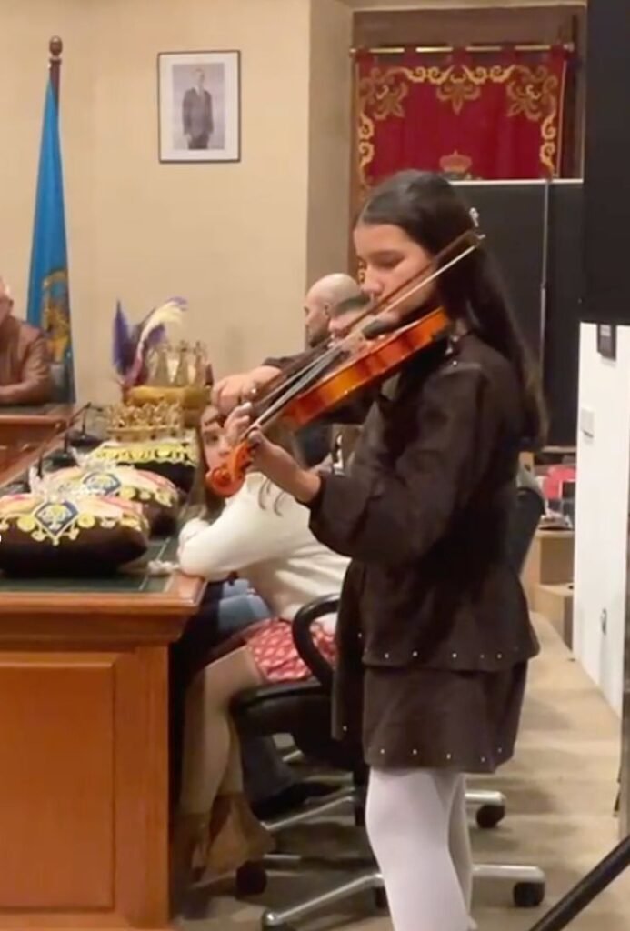 Otro de los instantes más emocionantes se produjo durante la recitación del poema “La Cabalgata de la Libertad”, cuando su hija Ana Sofía, de tan solo 9 años, acompañó con su violín la voz de su madre. La imagen de ambas sobre el escenario, unidas por la palabra y la música, reforzó el mensaje de transmisión generacional, emoción compartida y amor por las raíces.