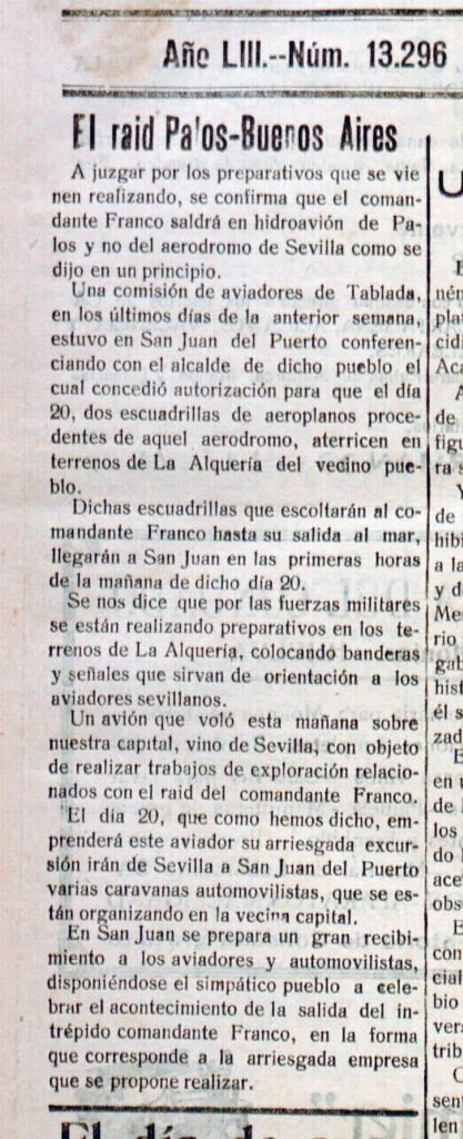 Echando una mirada a la prensa de la época, en ‘La Provincia’ el 11 de enero de 1926 se recoge “A juzgar por los preparativos que se vienen realizando, se confirma que el comandante Franco saldrá en hidroavión de Palos y no del aeródromo de Sevilla como se dijo en un principio. Una comisión de aviadores de Tablada, en los últimos días de la anterior semana, estuvo en San Juan del Puerto conferenciando con el alcalde de dicho pueblo el cual concedió autorización para que el día 20, dos escuadrillas de aeroplanos procedentes de aquel aeródromo, aterricen en terrenos de La Alquería del vecino pueblo. Dichas escuadrillas que escoltarán al comandante Franco hasta su salida al mar, llegarán a San Juan en las primeras horas de la mañana de dicho día 20. Se nos dice que por las fuerzas militares se están realizando preparativos en los terrenos de La Alquería, colocando banderas y señales que sirvan de orientación a los aviadores sevillanos. El día 20, que como hemos dicho, emprenderá este aviador su arriesgada excursión irán de Sevilla a San Juan del Puerto varias caravanas automovilistas, que se están organizando en la vecina capital. En San Juan se prepara un gran recibimiento a los aviadores y automovilistas, disponiéndose el simpático pueblo a celebrar el acontecimiento de la salida del intrépido comandante Franco, en la forma que corresponde a la arriesgada empresa que se propone realizar”.