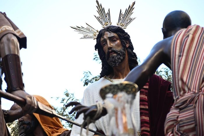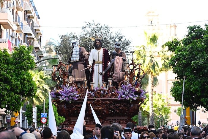 La Hermandad del Prendimiento volvió a dejar una de las imágenes más impactantes del Miércoles Santo en Huelva, con una salida procesional que destacó por la fuerza y la espectacularidad de su paso de misterio. Desde su barrio, la cofradía avanzó entre una gran expectación, con calles repletas de público que acompañó cada tramo del recorrido.