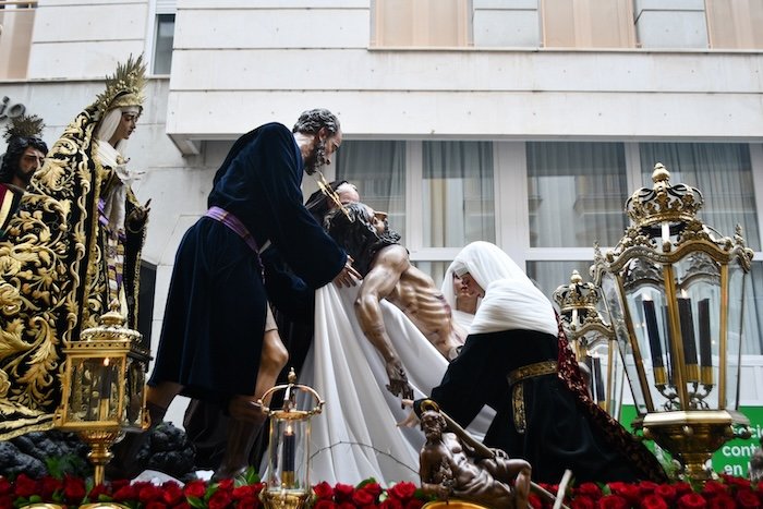 El cortejo, compuesto por nazarenos con túnicas azul marino y escapularios con el escudo bordado, recorrió las calles del centro de Huelva en un ambiente de recogimiento y devoción. El paso de misterio, que representa el momento en que el cuerpo de Cristo es descendido de la cruz, fue especialmente aclamado por los fieles en puntos emblemáticos como la Plaza Isabel la Católica y la calle Rábida.