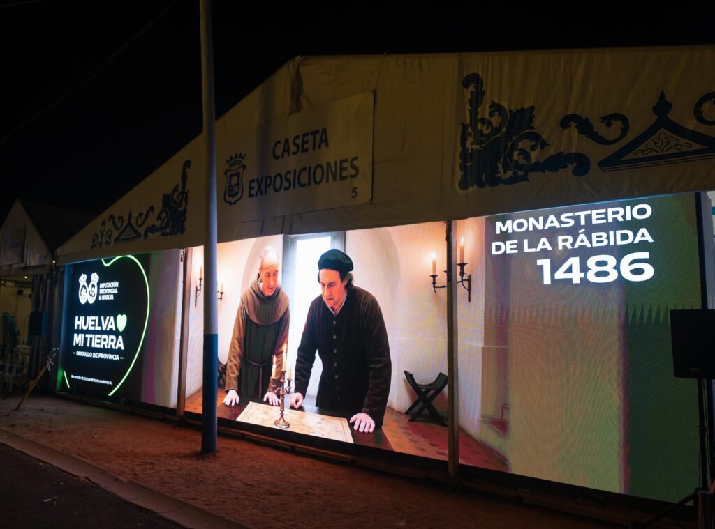 Otro de los grandes atractivos de estas Colombinas está siendo la Caseta de Exposiciones, un espacio que ha sorprendido por su propuesta estética, audiovisual y emocional. Desde su apertura el pasado miércoles, se ha convertido en una parada imprescindible para quienes buscan disfrutar de la cultura con sello onubense.