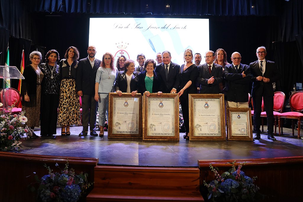 Noche de gala la celebrada en el Teatro Municipal Juan Alonso de Guzmán con la entrega de distinciones que el pleno acordara el pasado 10 de enero con motivo del Día de San Juan del Puerto 2025. Con un exornado escenario en presencia de la Corporación Municipal y personas galardonadas, el Ayuntamiento ha entregado las distinciones a los hermanos Antonio y Eduardo Báñez González y sus familias con el Premio de la Villa a la Promoción de San Juan del Puerto y a David González Cruz el Premio de la Villa a la Investigación y a la Cultura, así como el nombre de ‘Pedro Sandia Cano’ que llevará el futuro Centro Cultural de la calle Miramar aún por inaugurar.